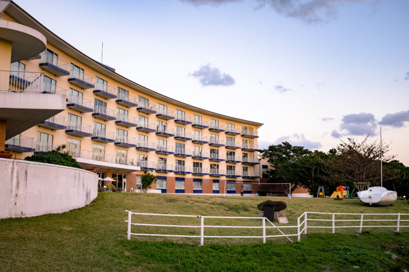 2日目のスケジュールをこなしてこの日は美ら海水族館の隣に位置するホテルマリンピアザオキナワでの宿泊。本当は那覇市内に手配していましたが、せっかく沖縄で泊まるなら朝はオーシャンビューで目覚めたいというミーハー的発想でこちらへ変更しておりました。海へと続く小高い丘に建っていて、広い芝生の庭や屋内プールを完備しており、目の前の海ではマリンスポーツが楽しめますしイルカだって泳いでいます。リゾート気分満点。