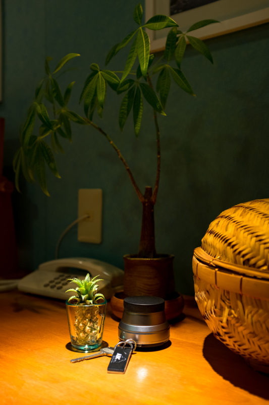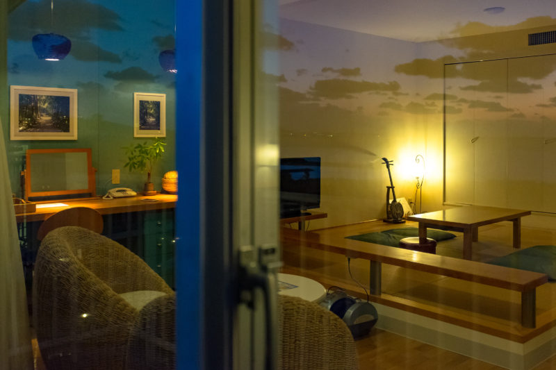 チェックインを済ませ案内されたのは驚く事にこのホテル最上階に1部屋だけとされる「やんばるルーム」。23畳の広い間取りは和洋室で最大5人が宿泊できるところ今回は私1人。なんて勿体ない使い方...。室内も贅沢にフットマッサージャーがあるだけでなく籐編みの椅子や三線までも準備されており自由に弾いて良いらしい...。ギターならまだしも三線は弾き方分からず構えてみただけで雰囲気のみ味わいました。