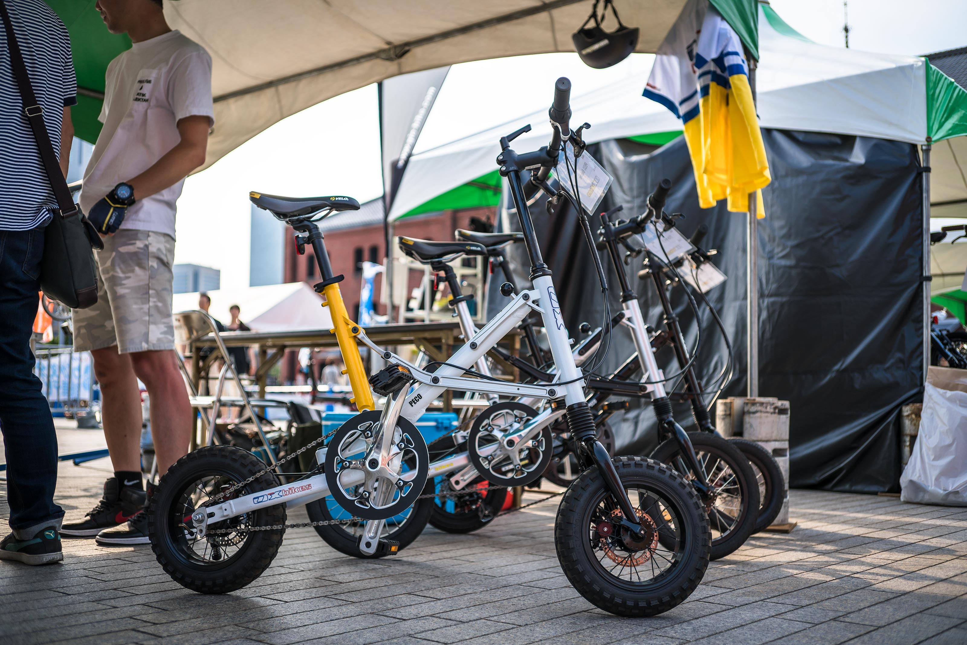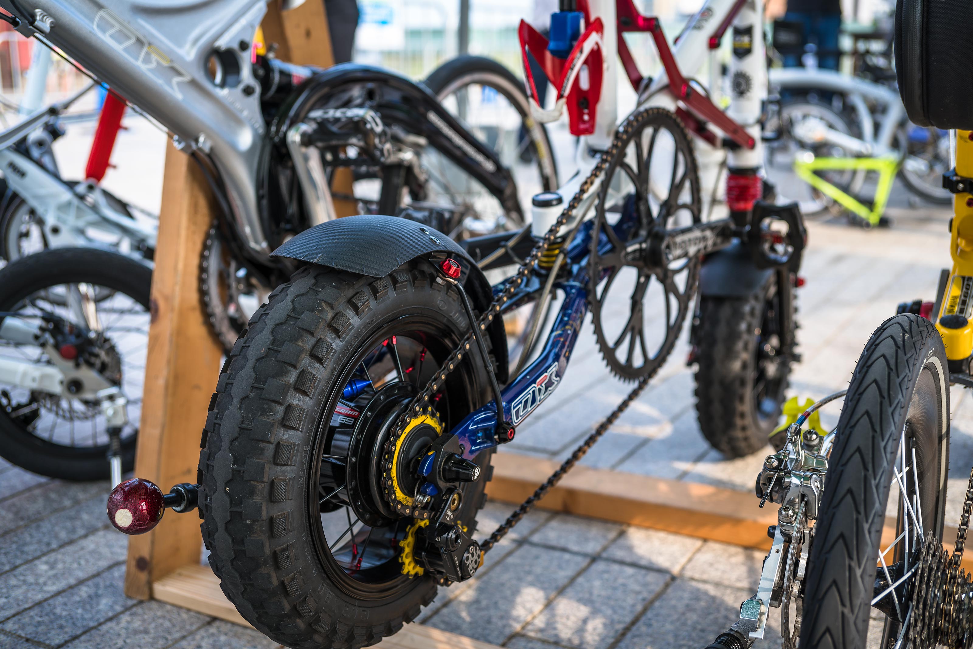 12インチという小型タイヤはオフロード向きのイボイボ極太3インチ。ファットバイクの超小型版といったところでしょうか。ただタイヤ径が小さいだけなら他にもありそうなものですがこのドーナツタイヤはなんとも可愛いのです。内装3段ギアらしいので小さくても結構実用的に走れるんだとか。