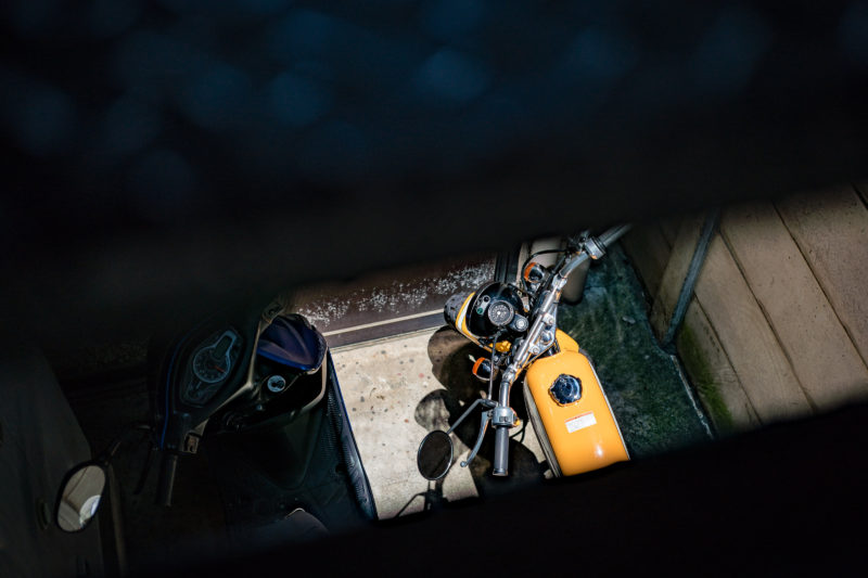 そんな愛車を引き取りに行った先で階段の隙間からふと目に入った黄色いオートバイ。なんだかとてもカッコイイ。昨日のカブの黄色も良いですがこちらもなかなかどうして魅力的じゃないですか!