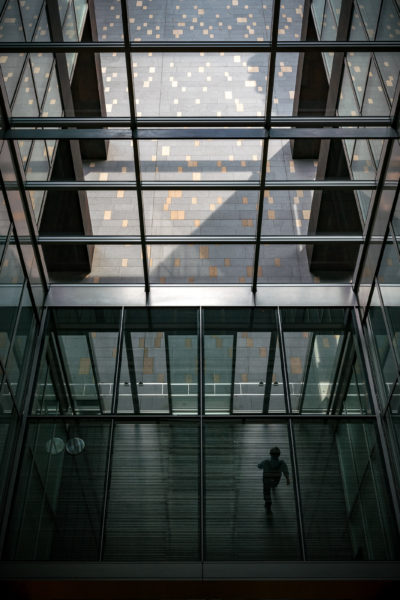 例えば上の写真のようなシチュエーションで、俯瞰気味にファインダーを覗いた場合、自分がそこにどんな偶然を望むのかを頭の中で重ね合わせます。私はこの単調なガラス張りのフロアーに人の動きをシルエットで表現するのが面白いだろうと考え、その偶然を待って3回シャッターを切っています。1回目は露出確認用、2回目と3回目がこの2枚というわけ。