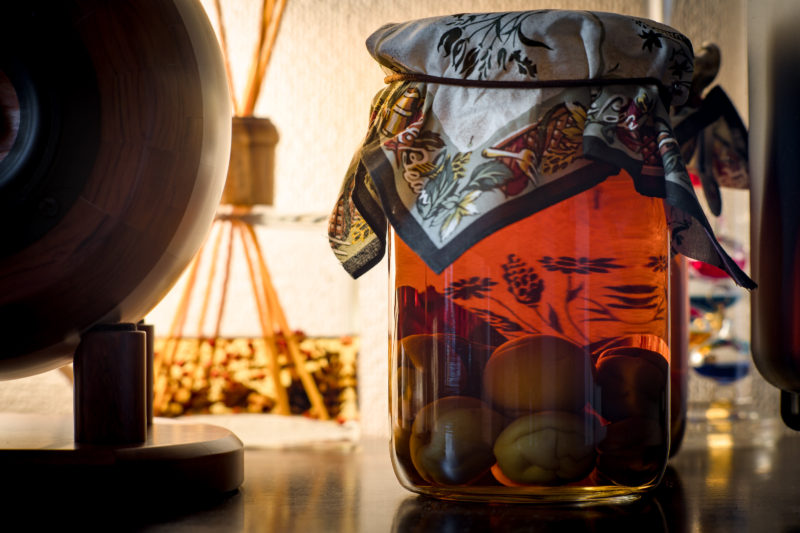 全ての瓶はインテリアの役割も兼ねている為部屋の中に置いてあるのですが、埃が被らないよう写真のように絵柄が描かれた布を被せてゴムで固定しています。ガラス越しに見える植物の絵柄はまるで梅の実から生えているようでこの角度から眺めるのが結構好きです。