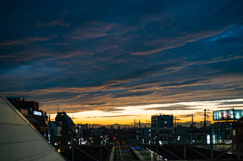 東京の夕暮れ、こう見えて小雨が降っていたりしますから一部地域では虹も見えたようですね。どす黒い雲で変な空でした。これは使い慣れた40mm単焦点レンズで撮影。