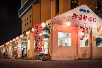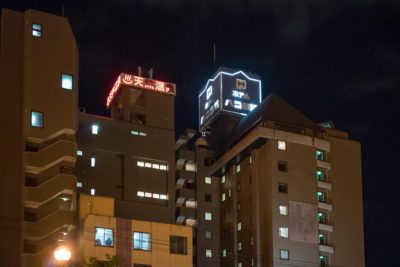 そんなふうにライトアップされた橋の反対側にはなにやらジージーと音を立てる看板が。頭上も遥か上のほうにホテルや温泉のネオンが半分切れた状態でチカチカしていました。看板自体はなにも珍しいものではないのですが、最近は看板もLED自発光やライティングされるものが増えたので ”ネオン” というのがなんだか懐かしさを感じたんですよね。アメリカ映画の1シーンに出てきそうな音だったので。しかも2軒並んで切れかけているって...。