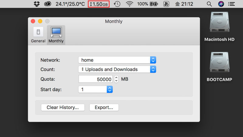 問題は自宅のパソコン環境とiPhoneのモバイル通信の合計が50GB/月で収まるかどうか。プランは他にも検討の余地はありますが、ひとまず1ヶ月あたりの自宅のネットワーク通信量を調べるべく ”Bandwidth+” なるアプリケーションをMacに導入しました。これにてその日の通信量と1ヶ月分の積算量が一目で分かりますから、ひとまず10/1から1ヶ月間データを取ってみたいと思います。
