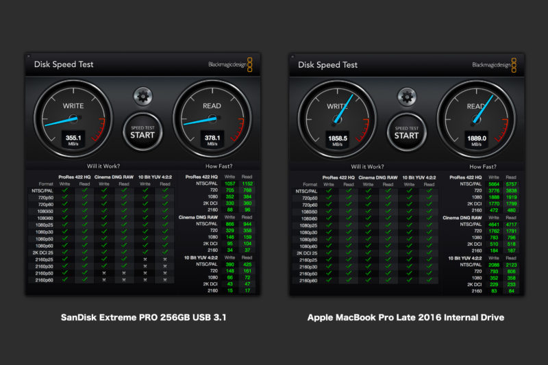 一応参考までに自宅で愛用しているMac Book Proの内蔵ドライブの計測も行ってみました。そしたらまぁとんでもない値でして、読み書き共に1800MB/秒オーバーでした。2GBのデータを1秒ちょっとでコピー出来てしまう計算。よくあるノートPCの高速SSDは読み込みは速いけれども書き込みはほどほどっていうものが多いのですがMacはケタ違いの性能ですね。