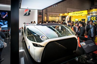 そしてその車両がなぜブリジストンブースに展示されているかというと、当然そこには「ECOPIA with ologic」このタイヤが使われているわけです。ソーラーカーレースの上位に食い込むチームの多くはこのタイヤを使っているのだとか。私もあと20歳若かったら一緒に参加してみたい!なんて考えたでしょうね。