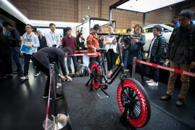 ブリジストンブース、言ってみればタイヤメインの会社なのであまり派手な展示は想像出来なかったのですが、ソーラーカーの実車展示以外に人気を集めていたのが下の自転車。