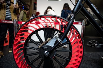 なんの事はない動力を持たない人力の自転車ですが、そのタイヤに秘密あり。空気が不要なラバー素材のタイヤですからパンクの心配がない! ただし通常のタイヤはその空気によって路面から伝わる振動を上手く吸収して乗り心地の良さに繋がっているわけですが、このタイヤの場合は空気による吸収ができませんから、その代わりに特殊形状のプラスチック製スポーク(赤色部分)が振動吸収の役割を果たしています。