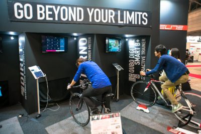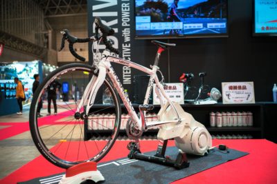 ハイテクっぽいものはSHIMANOブースだけでなく会場のあちこちで目にしました。最近は自転車トレーニングというとこんなふうに液晶画面に向かって走るのだそうです。実はこのシステム私の知人も自宅で使っています。
