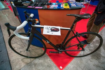 それはそうと、驚くのはまだ早かったです。小物パーツが並べられた台の手前にさり気なく置かれていたロードバイク。そこに貼られた数字を見てびっくり。4.18kgと書かれておる!