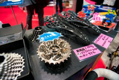 赤いじゅうたんに集まる人集り。何やら気になるパーツが並べられているのが目に入りました。実は以前私も購入を検討したのが肉抜き仕様のスプロケット。つまりはリアのギヤの集合体の金属部分を可能な限り肉抜きし軽量化を図っているというものなのですがこれが驚くほど軽い。元々が金属の塊で重たいパーツですから肉抜き効果が高い上に軽量な金属を使っているようで見た目以上の結果。