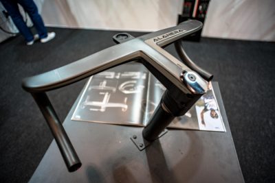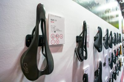 サドルもびっくりです。selle ITALIAのブースでは各モデルが壁に取り付けられていてワンタッチで手に取って見られるようになっていたのですが、一番手前のカーボンモデルはなんと63グラムです。毎日持ち歩いているiPhone 6Sが約150グラムですから、このサドル2個よりもiPhone 1個のほうが重いという信じられないような現実。私のトレンクルに組み合わせている同じくselle ITALIAのSLRが125グラムで、初めて手に取った時はその軽さに驚いたのですが、現在は更に半分の軽さなんですね。