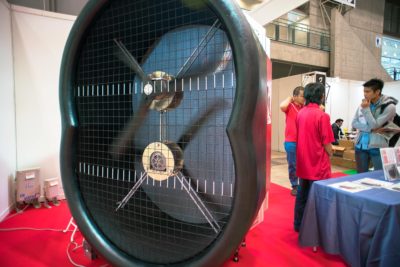 サイクルモードには何も自転車ばかりが並んでいるわけではありません。今回初めて目にしたのがこちらの風洞実験装置。つまりは大きな扇風機。こんな紹介の仕方では怒られてしまいますね。