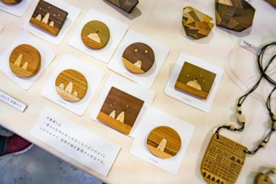 そしてこちらは今回のイベントで初めて知った技法 ”木象嵌(もくぞうがん)”。一見すると単なる木製コースターのようですが、そこに描かれている模様に魅力があるわけで。ベースとなる板を絵の形でくりぬき、別の木をはめ込んで模様を作る技法をそう呼ぶそうですが、いったいどうやって正確に2種類の木を全く同じ形に切り抜くのか、レーザーカッターを使えば簡単に出来そうですがその場合は切り抜いたエッジが焦げてしまいますからここでは適さないかもしれませんね。