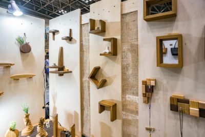 一口に木材といっても色々な活用法があり、壁に取り付けて使うコの字型の棚を展示していたブースもありました。単なる棚なら珍しくはありませんがこちらの棚は全て磁石により固定されています。話を聞いたところ近年はネオジウムマグネットが登場したおかげで小型のものでも驚くほど強力にくっつくため、こうしたアイデアが生まれたそうです。