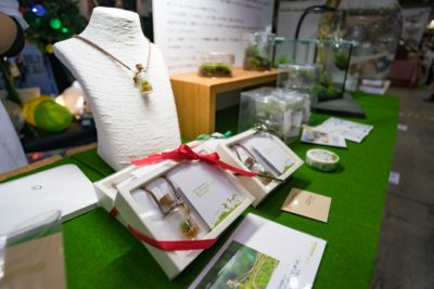 自然植物が相手ですし毎回見ていますので急に大きな変化が期待出来るものではありませんが、今回驚いたのは苔もついにアクセサリーに展開! 苔を入れた小型の瓶がメインのネックレス。いよいよ苔を首からぶら下げる時代ですか〜。