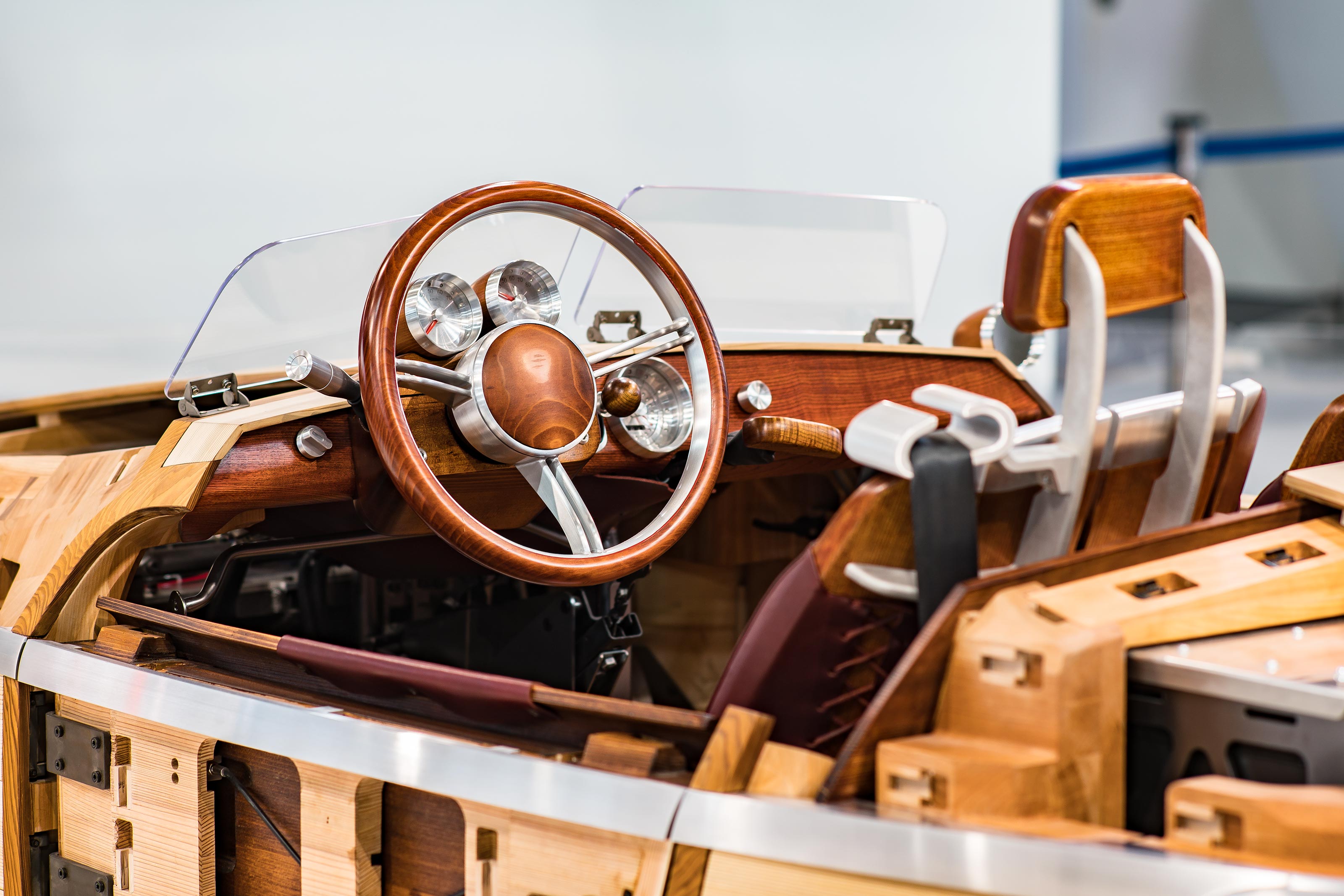 昔の馬車に代表されるようにもともと車は木で作られたのが始まりと理解していますが、ここまで徹底していると美しいですね。現実的には今風に言うと衝突安全性をクリアー出来ないとか、そもそも素材の経年変化が激しく強度テストも納車時と数年後では全然違ってしまうとか、オーナー目線で言えば直射日光に当たると日焼けしてしまってみすぼらしくなってしまうとかいろいろあるでしょうが、雨天走行をしない私のような人からすれば維持管理を含めこれで公道を走る事だって不可能ではないと感じます。