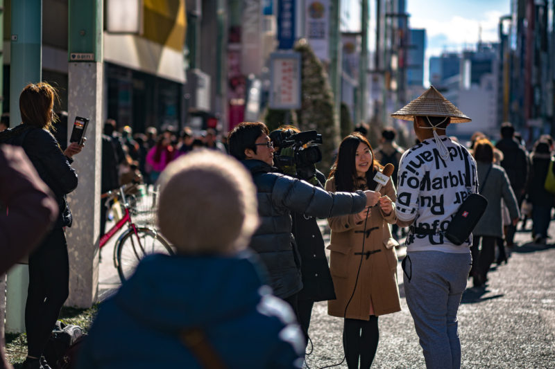 多くのビルがひしめきあっている銀座の街。ただビルが多いだけなら他の街と変わりませんが、週末の日中は歩行者天国になるという点が ”街を歩く” 楽しみだったりします。その歩行者天国を良いことに銀座通りでは50メートル間隔くらいでテレビ番組の街頭インタビューが行われていますね。あまりに取材人の数が多くて最近は度が過ぎている気もしますけど...。
