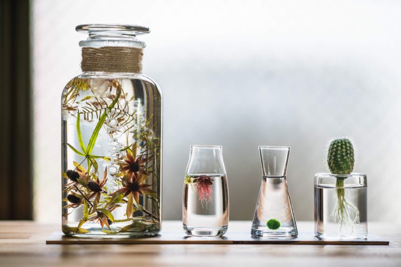 一番左の大きいのはハーバリウムなので水ではなくオイル漬けですが、右の3つは全て水道水で飼育。右からサボテン、2番目がマリモ、3番目が浮き草。今回の新入りは2番目と3番目でいずれも無印良品で購入可。浮き草はMixを購入した為品種までは分かりませんでしたが恐らく緑のものがドワーフフロッグビットで、赤いのがフィランサス・フルイタンス。根まで真っ赤なのが特徴ですね。