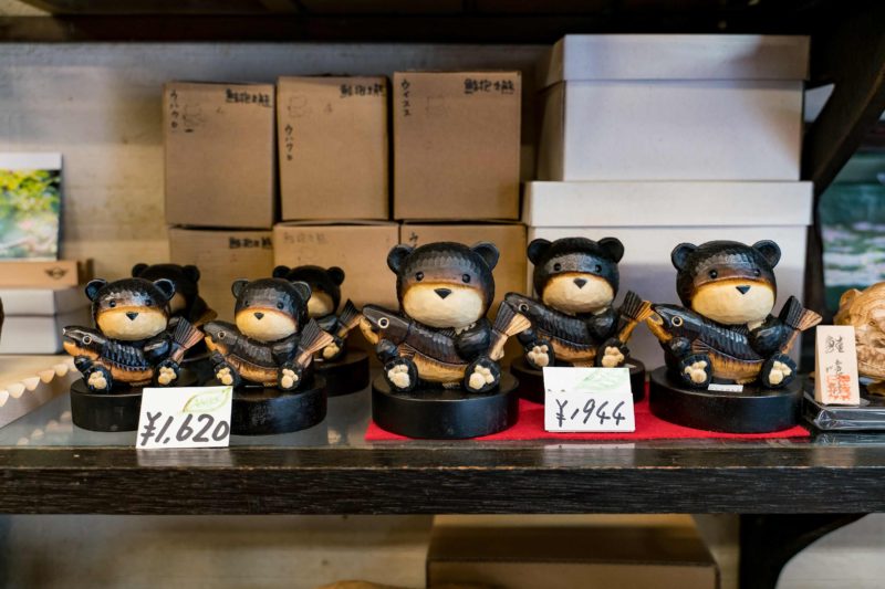 極楽通り商店街にはお土産屋さんも何軒か並んでいます。そこで食べた ”はみちつソフトクリーム” はなかなかの美味でしたね。勿論置物などの一般的なお土産も多数並んでいますが、北海道と言えば ”鮭を銜えた熊” というくらい木彫りの熊が連想され、親戚の家に行くと1度は見たことのある定番土産だったりした時代があるようですが、さすがにそれらの置物も現代風にアレンジされ随分カワイイ形に変わっていました。こうしてみると熊の鼓笛隊に見えてしまいますけどね。