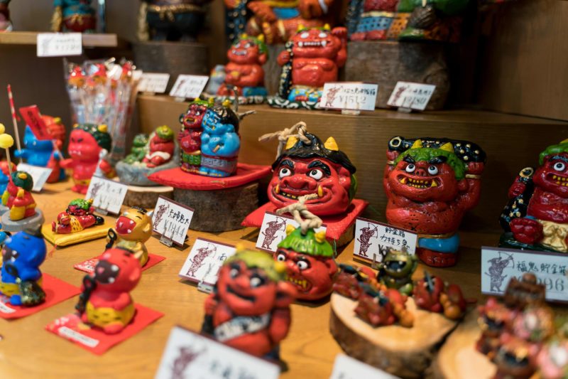 一番目につくお土産はやはり鬼の置物。沖縄で言うところのシーサーの置物みたいな位置づけでしょうか。むしろシーサーの横にこの鬼を置いても全く違和感ないくらいシリーズもののお土産って感じですね。