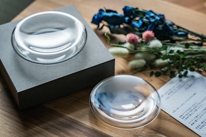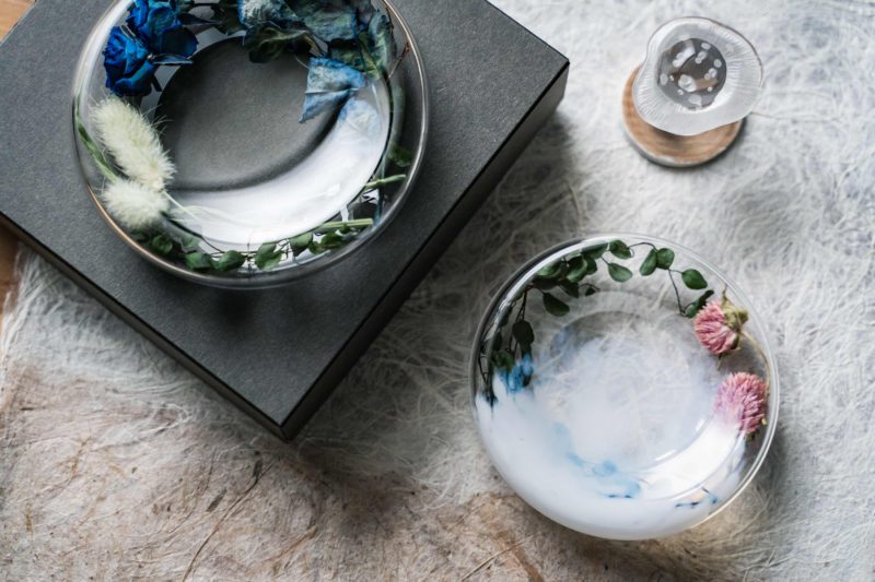 このお皿の最大の魅力はなんといっても内部の空洞を活かしたデザインの自由度。使い方は購入者次第ですが、やはり中に花を入れるのが美しい! 私も会場の他のブースでハーバリウム用として販売されていたドライフラワー(ラグラスバニーテール、ワイヤープランツグリーン、ブルーローズ)を購入してきて帰宅後に上手く組み合わせてみました。ガラスとボタニカルって相性が非常に良い! カッコイイじゃないですか。これを食器として使うも良し、インテリアとして飾るも良し。私はこの上にプランツ等を組み合わせてみようと考えています。
