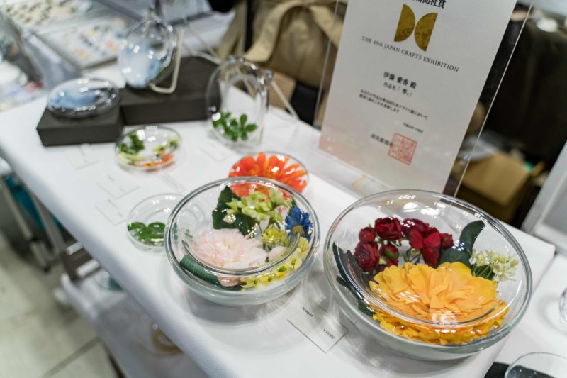 下に掲載したitsuka glass worksさんのブースの写真にもあるように、このシリーズはもっと大きなボールサイズみたいなものも存在していてそれはそれで良かったです。金魚とかメダカを飼う事だってできそうですね。普通は小物を置いたりとか、食器として使うならサラダとかフルーツとか盛りつけるんだと思います...。どの商品も非常に丁寧に仕上げられていて美しさが特徴ですね。