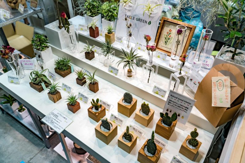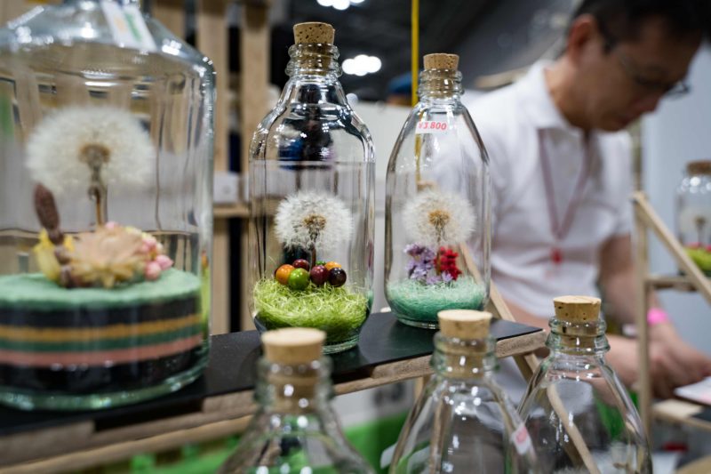 面白いものを展示しているブースがありました。ガラス瓶の中にボタニカルを配置したテラリウム風の作品は沢山ありますがこちらのものは少々違和感があります。なんとたんぽぽの綿毛がそのまま瓶の中に固定されている! 手に取って見せてもらいましたがどこにも瓶を切ったり貼ったりした跡は無く無加工でこれを実現しているのです。