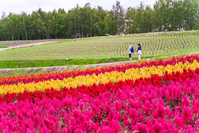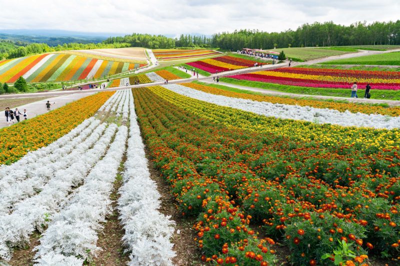到着してみての結果は御覧の通り、花畑一面が満開で圧倒されるくらいカラフルな大地が待っておりました。これは老若男女国境を越えて誰の目にも美しく見えるでしょうし、他ではなかなか見る事のできない景色。花畑だけならテーマパークなどにもあるでしょうが、ここは北海道ならではの滑らかな曲線を描く大地とのコンビネーションでいっそう芸術美にプラスに働いている気がします。