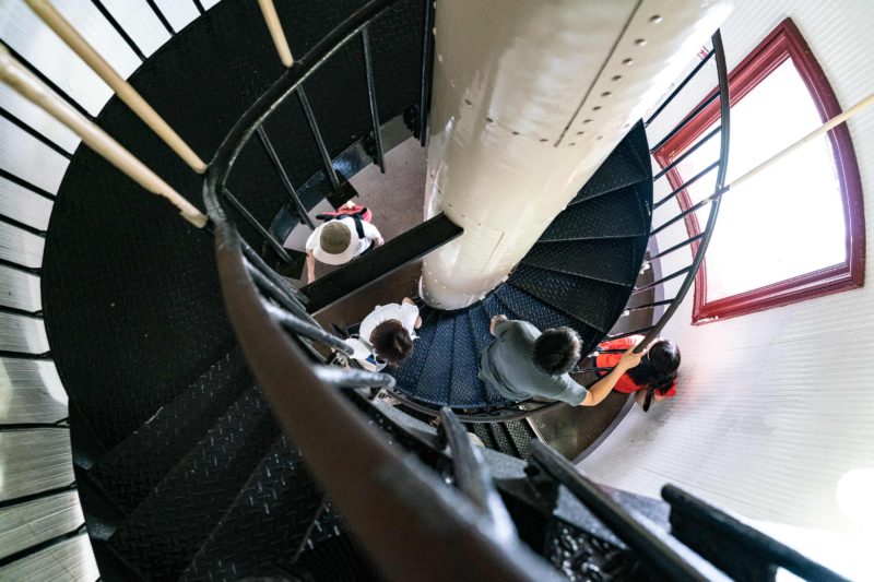 実際、かなり大変でした。階段も最後の10段ぐらいはハシゴに近い急勾配で両手で手すりを持たないと上がれない!降りる時も後ろ向きじゃないと降りられないくらいでした。でもそれ以上に驚いたのは、この灯台は ”土足厳禁”。入り口で靴を脱いだら下駄箱に入れて靴下のまま階段を上るのです! そんな灯台見た事ありません。