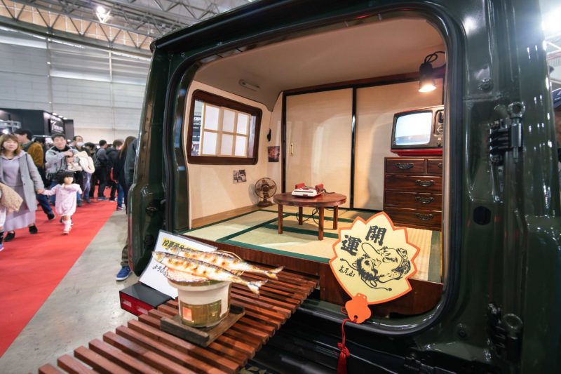 最後は癒し系ジムニーで。外観は結構イカツイんですけどね。インテリアはなぜか和のテイストでまとまっています。しかし実用性というよりは昭和のミニチュアセットという感じで。
