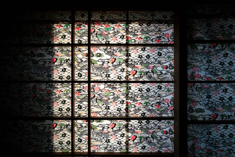 これは私の先入観かもしれませんが、障子というと普通は無地の白か、柄が入っているとしても白柄で、ここまで派手にカラーのものは珍しい気がします。もちろん世の中には色柄ものの障子紙というのは出回っているでしょうが、特殊な建物などに使うならまだしも一般のご家庭でこういうのは見た事がありませんでした。