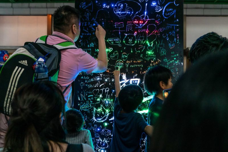 今年はどうやらペイント関連というか、どちらかというとペイントをはがす行為でアート化していく感じでしょうか。もともと黒く塗られているボックスの壁に何かしら硬いもので文字や絵を描くとペイントが剥がれ、内部のLED光源が透過するという仕組みで、原理はいたって簡単ですが暗闇にレインボーカラーの光源がキラキラと輝くので皆夢中で書いていました。