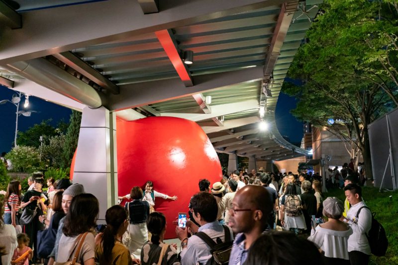 今年のイベントで注目ポイントはこの大きな赤い玉。「単なる大きな風船でしょ」とかそういう冷めた目で見てはいけません。この玉は六本木の街を毎日場所を移して出現すると言われていて公式WEBサイトでも出現場所が予告されていました。私が訪れた時は六本木ヒルズ前の広場で歩道の屋根との間に挟まっておりました。皆その存在を知っているのか次々人が集まってきては記念写真を撮っていく...。どんな意味があるのか知りませんがこういう演出は結構好きです。