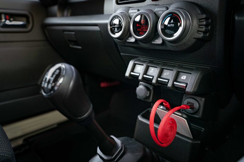 私はそういうのは我慢ならんので、事前に準備してあったこの赤い ”形状記憶ケーブル” を組み合わせています。最大で80cmまで伸ばすことができるのでシートに座ったまま普段通りスマホの操作ができ、不要な時はスマホを小物入れに置けばケーブルは自然にシュルシュルっと丸まって邪魔にならない。なかなかの便利グッズです。ただこのケーブルが日本国内だともうどこにも売っていないようで、Amazonでも1〜2ヶ月配送になっています。実は赤いケーブルを購入した理由もそこにあり、本来は黒やグレーを選びたかったところ在庫はこの赤1本しかなかったという...。まあ現段階では良しとしますか。