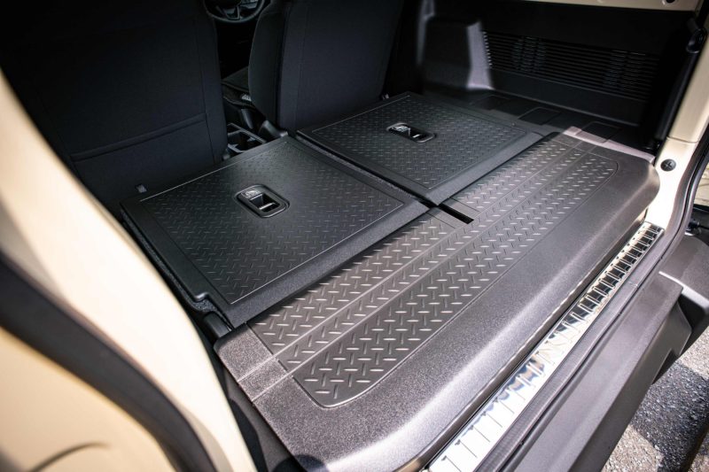 リアシートに関するメーカーの謳い文句的には「濡れたものをそのまま積み込んでもプラスチック素材で耐水!」みたいな事が書かれていますが、濡れたものを積み込む事ってそうそう無く、むしろ日常使いの荷物がプラスチックの上で右に左にズルズル滑って安定しませんからマットを敷いて対策というわけです。