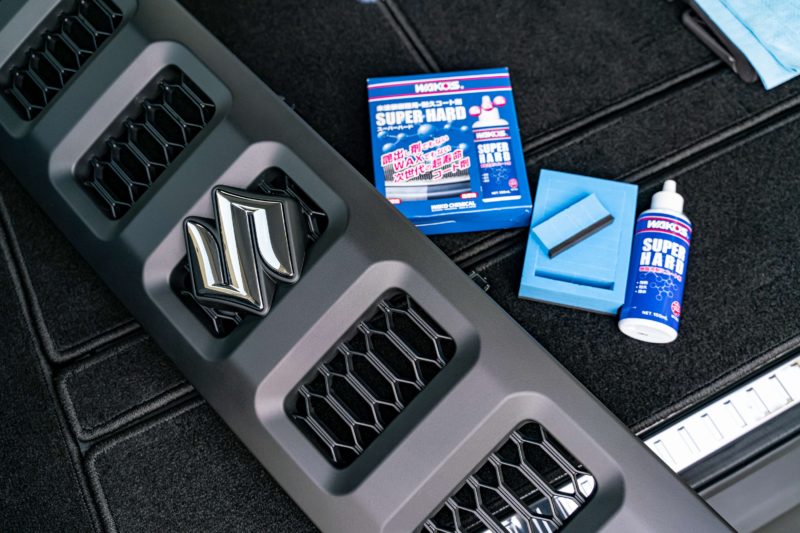 今回、愛車ジムニーの樹脂パーツに施工したのはWAKO’SのSH-R未塗装樹脂用耐久コート剤 SUPER HARD。150mlで6,000円。何かの間違いじゃないか!と思うくらい高い。