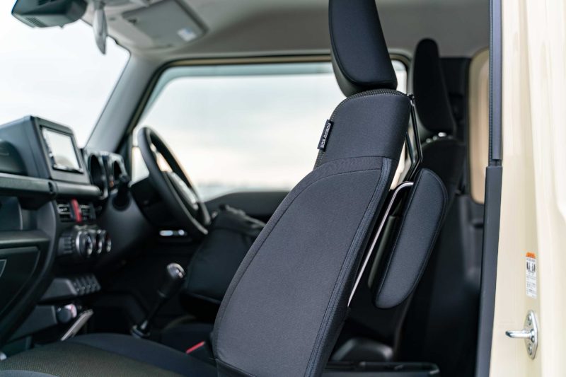 JB64Wジムニー用のヘッドレスト収納アイテムとしてはこの他に後席脇のひじ掛けあたりに取り付けるブラケットが2種類ほど商品化されていますが、そちらの場合リアスピーカー開口部を塞いでしまったり、高さ調節が微妙でひじ掛けにロッドが当たりそうな雰囲気でしたので、私は助手席にセットするこれをチョイスしました。