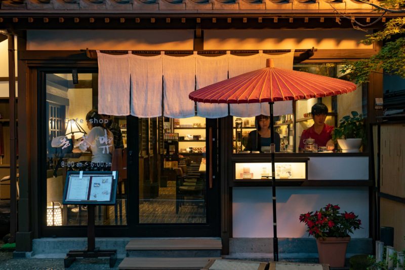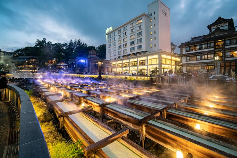 湯畑の夜というと電球色に照らされた湯気がモクモクというイメージでしたが、そこは現代の技術で時々青白いLEDでライティングされ、観光地に少しのイベント感が取り入れられています。この季節でさえ湯気の量が多いのでカラーライトが映えますが、冬の寒い時期になったら空間演出のごとく更に豪快に染まるのでしょうね。