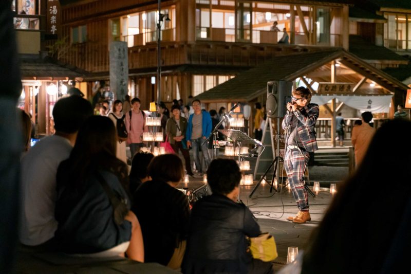 この日が3連休の中日だったからなのか、湯畑の脇にあるイベント広場のようなスペースではブルースハープ奏者が皆の前で演奏をしていました。ビートルズのLet it Beをオリジナルアレンジを加えて演奏していましたが、これがなかなかカッコよかったです。