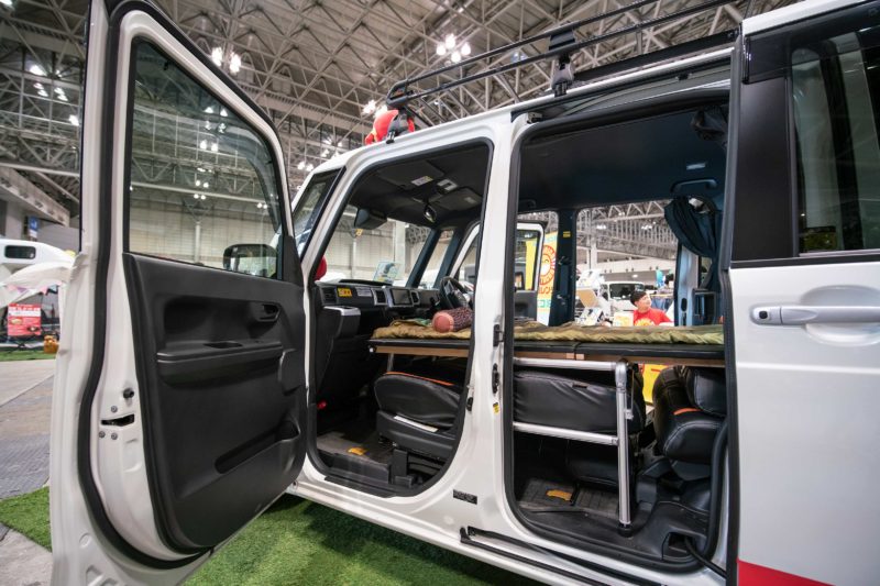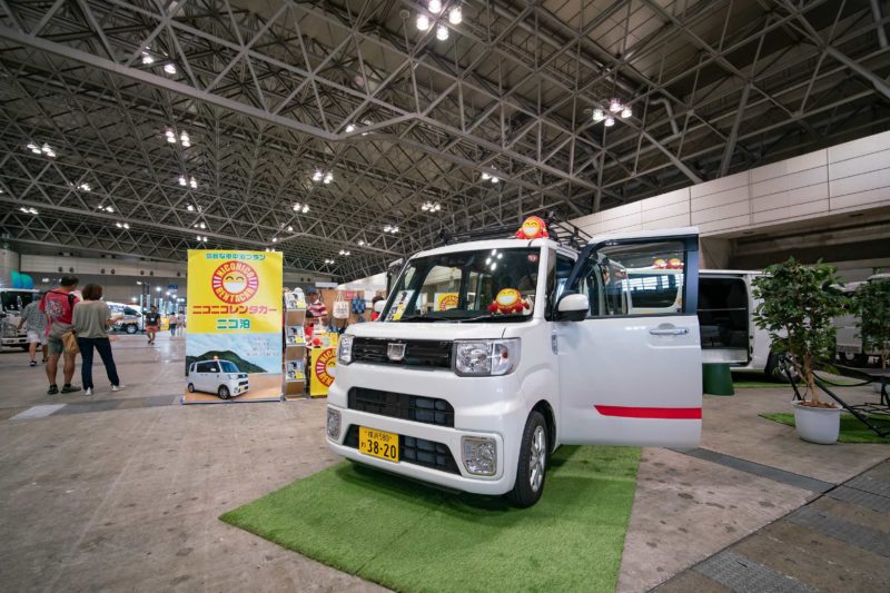 会場入りして一番最初に目に飛び込んできたのがこちらの車。ダイハツのウェイクだそうですが、なんとニコニコレンタカーが車中泊プランを提案。