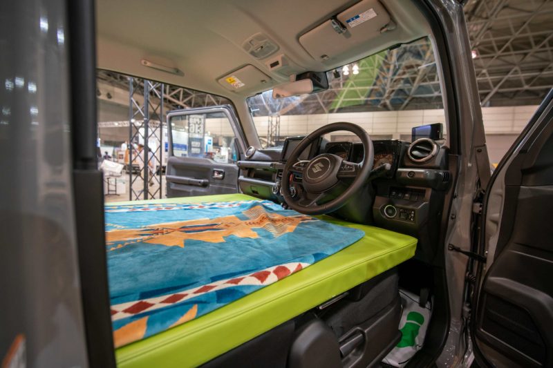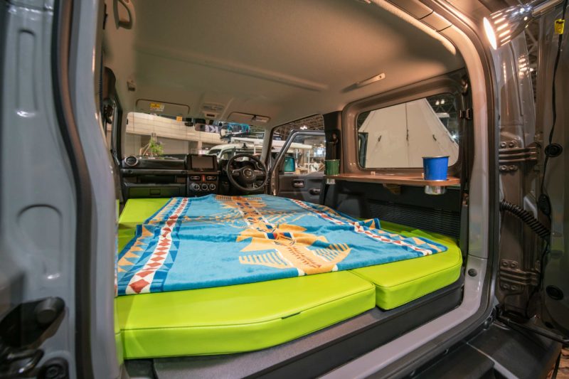 メインは何と言ってもこのように美しくフラット化を実現するコンフォートベッドキット。いやぁやられちゃいますねこれは。キャンピングカーのソレと全く同じ素材を使い、6cmという絶妙な厚さで寝心地と強度を両立させたベッドをジムニーにフィッティングさせた専用品。