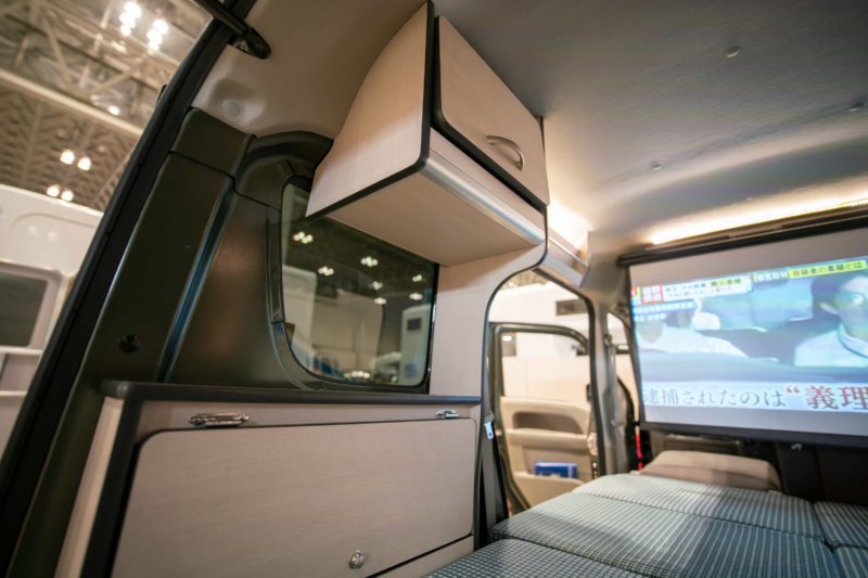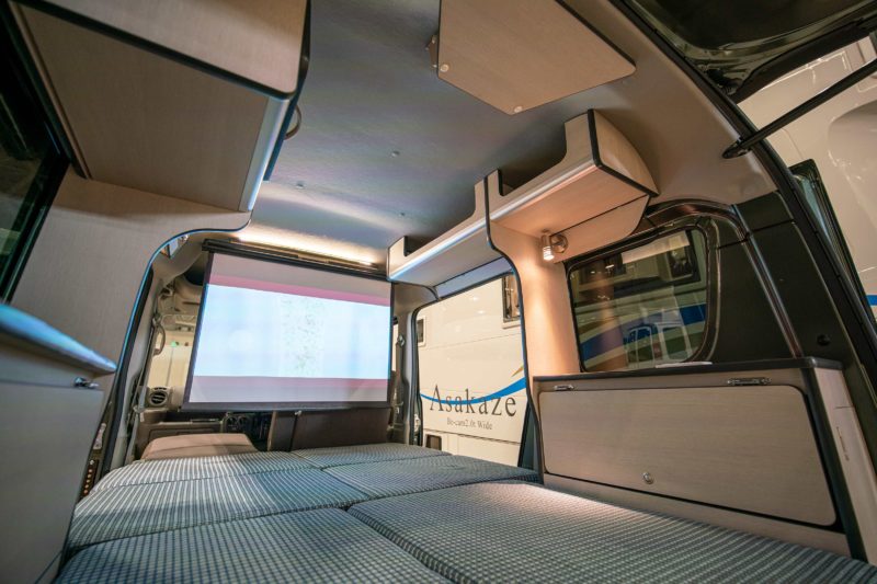 この写真でわかるかと思いますが、前席背後にスクリーンが取り付けられており天井に固定されたプロジェクターで40インチクラスの映像を映し出すことが出来ます。静かな山奥で寝転がりながら映画を見る!なんてことが実現するわけですね。プロジェクターとスクリーンはオプション扱いです。