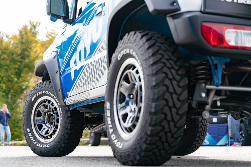 新型ジムニーが発売された事でTOYOタイヤのOPEN COUNTRY R/Tはメーカー在庫が無くなるくらいの売れ行きらしくもはや定番となりつつある銘柄ですが、今回展示されていたのは同じくOPEN COUNTRYですがM/Tの新型。なんでもTOYOタイヤ初のホワイトレター仕様なんだとか。確かにそのホワイトレターに憧れてBF Goodrichを選ぶ人もいるくらいですから、人気のOPEN COUNTRYでそれが標準仕様となれば尚更注目となりそうです。
