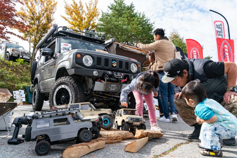 さてこちらのジムニー、新車購入時、私がベージュと悩んだかっこいいボディーカラーのグレーです。しかし多くの人の目線はそちらではなく手前にあるラジコン。そのモデル、ジムニーというよりパジェロミニに似ていますが...。子供たちがプロポ片手に会場内を走らせていました。こういう会場に家族で来る場合、奥さんと子供たちをいかに退屈させないか!そのあたり気を使うのでしょうか。