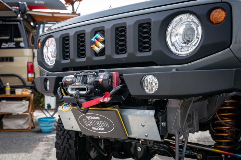 道無き道を走るようになるとこれがあると心強いウインチ。4駆だからと言って初めからウインチを取り付けるステーなどが準備されているわけではありませんから、取り付ける際は十分な強度の場所を探してワンオフ加工をするのでしょうね。基本的にはフレームに固定するのでしょうが、車重以上の力が1点に集中することを考えると周囲は相当補強しないといけないように思います。