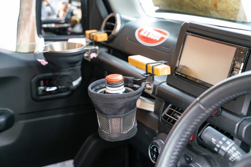 上の車に取り付けられていたドリンクホルダー。既製品のようにも見えますし手作りのようにも見える。いずれにしても布製のドリンクホルダーって私好みです。プラスチックや金属製のように振動で音が発生しにくいですし、取り付け場所からしても安全面を考慮すれば柔らか素材でまとめたいところ。これでボルト留めではなくワンタッチで取り外し可能だったら最高だと思います。