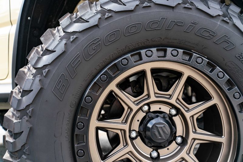 迫力の理由は何と言ってもこのタイヤでしょうね。265/75/16ですよ! ノーマルが175/80/16ですからね、10cmくらい幅広な上に75ですから水陸両用車みたいなドーナツタイヤ。1,500ccもあるシエラのエンジンでもさすがにパワー不足なんじゃないかと思いますがエンジンとかもいじっているんでしょうかね。