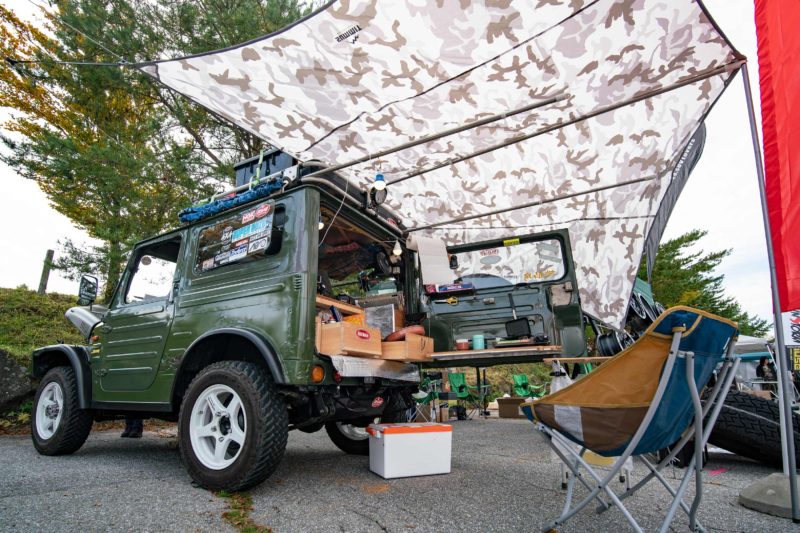 シートアレンジなどの実用性は新しい車には敵わないでしょうが、こうしてタープやテントと組み合わせて居住空間の一部にジムニーを配置するとたぶん大自然の中に ”自分空間” が作れて充実感は高そうです。